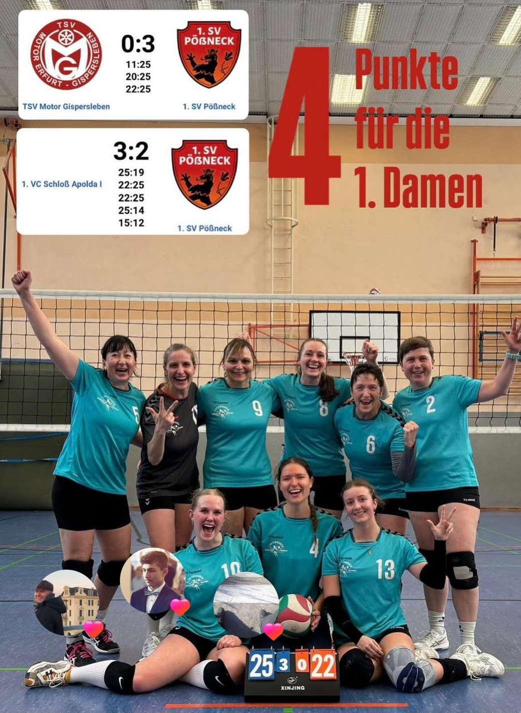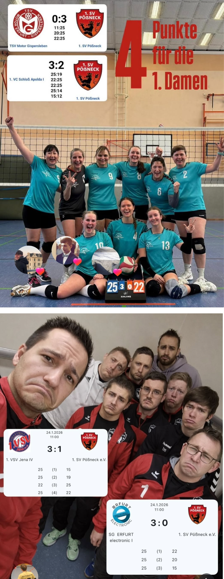 Hoch motiviert fuhr die erste Damen mit neun Spielerinnen zum Punktspiel nach Erfurt. Im ersten Spiel gegen den Gastgeber Erfurt Gispersleben konnten die Pößneckerinnen bereits im ersten Satz mit souveränem und hochklassigem Volleyball überzeugen. Die Fehler wurden vorwiegend von den Gegnerinnen gemacht und der erste Satz konnte mit 25:11 Punkten gewonnen werden. Die Sätze 2, und 3 konnten ebenfalls aufgrund von starken Auschlägen, sicheren und durchsetzungsfähigen Angriffen und Blockaktionen am Netz mit 25:20 Punkten und 25:22 Punkten für die Pössneckerinnen gewonnen werden. Franziska Bernhardt wurde als MVP gewählt.